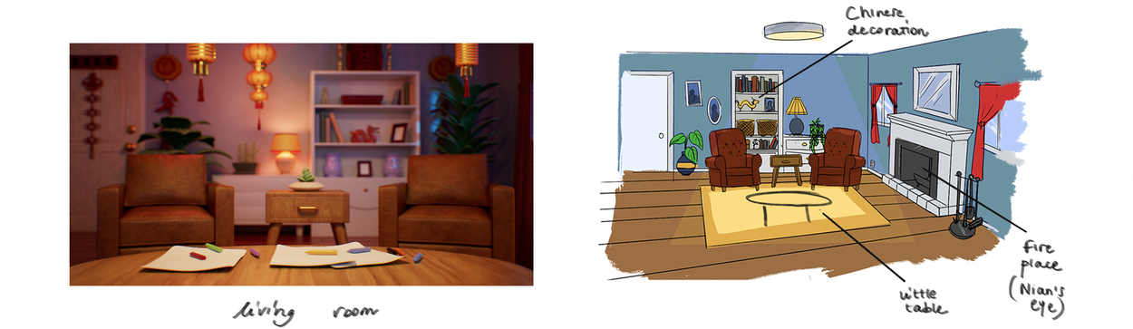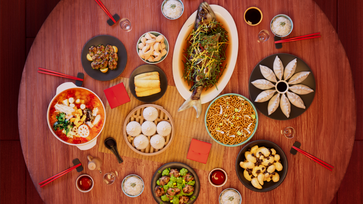 Wherever we could we made sure to include elements of Chinese culture, like showing the types of food that would be eaten at a Lunar New Year dinner. Lanterns and decorations were designed with specific feedback from the team at Panda Express, many of whom celebrate Lunar New Year with their families every year. We wanted to be as accurate as possible in every element we included.